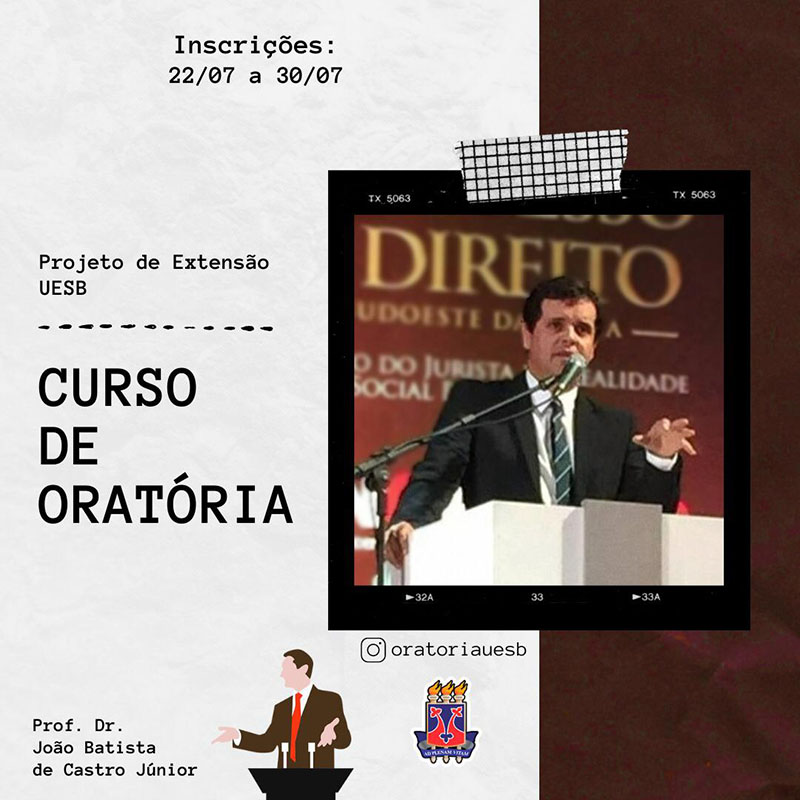 A coordenação do Curso de Oratória estará a cargo de João Batista de Castro Júnior, professor adjunto do Curso de Direito da UESB, Juiz Federal titular da 1ª Vara, Mestre em Linguística Histórica e Doutor em Linguística e Cultura pela UFBA, ex-Promotor de Justiça, inclusive Promotor do Júri, ex-Professor da UNEB e da FAINOR.