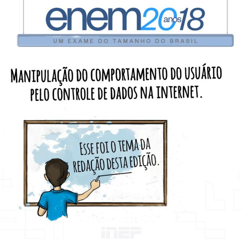 O tema da redação do Exame Nacional do Ensino Médio (Enem 2018) é "Manipulação do comportamento do usuário pelo controle de dados na internet". O tema da redação do Exame Nacional do Ensino Médio (Enem) foi divulgado pelo Instituto Nacional de Estudos e Pesquisas Educacionais (Inep) no início da tarde deste domingo (5). Ao G1, Thiago Braga, professor e autor de redação do Colégio pH, afirmou que o tema não é um dos mais simples para os estudantes. "A princípio não me parece um tema fácil porque possibilita uma série de leituras, pode levar o aluno para uma direção diferente do que a banca quer", afirmou ele. "É voltado para o comportamento, não parece ligado a política, mas sim mais ligado a costumes. Depende de qual direção vai dar, dos textos dados de apoio." Segundo Braga, vários assuntos podem ser abordados. "Os alunos podem falar sobre privacidade, sobre como hoje ela não existe mais", disse ele. "Se você está na internet os seus dados são utilizados para que você seja conhecido e seja conduzido a determinado tipo de comportamento. isso pode ser problematico porque as pessoas acabam perdendo [a privacidade]."