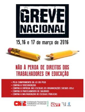 A Confederação Nacional dos Trabalhadores em Educação (CNTE) convoca os trabalhadores da educação para participar da Greve Nacional, que será realizada nos dias 15, 16 e 17 de março de 2016. O motivo dessa mobilização é contra aperda de direitos dos trabalhadores em educação, contra a militarização e a gerência de Organizações Sociais nas escolas públicas, contra a “lei da mordaça”, contra o fechamento indiscriminado e autoritário de escolas, para contrapor os retrocessos impostos à escola pública e a seus profissionais. O diretor regional da APLB-Sindicato, Jânio Soares Lima, falou sobre a pauta de reivindicações da categoria. “Com relação às pautas da educação, cobraremos a implementação do reajuste do piso do magistério nos planos de carreira (sem parcelamento de salários e com integralidade do 13º e das férias), a aprovação dos projetos de lei do piso e das diretrizes nacionais de carreira para todos os profissionais da educação, bem como a execução das estratégias previstas no Plano Nacional de Educação, entre elas, a do Custo Aluno Qualidade e do Sistema Nacional de Educação”, disse.