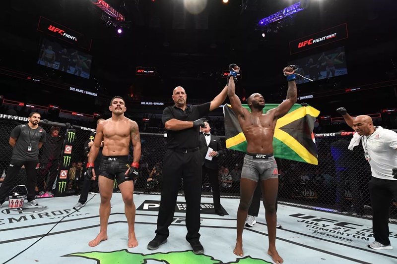 Com uma atuação de alto nível estratégico, Leon Edwards dominou Rafael dos Anjos na luta principal do UFC San Antonio e venceu por decisão unânime (50-45, 49-46 e 49-46), pelo peso-meio-médio (até 77kg). O inglês engatou a oitava vitória consecutiva e pediu para enfrentar Jorge Masvidal em seu próximo compromisso. Com uma performance completa, ele foi superior ao brasileiro em todas as áreas e impôs ao rival a terceira derrota nas últimas quatro lutas. A luta começou de forma surpreendente, com Leon Edwards conseguindo uma queda. De dentro da guarda de Dos Anjos, ele trabalhou com calma, ganhou a meia-guarda, mas o brasileiro laçou uma das pernas do rival, aplicou cotoveladas na cabeça e ameaçou um ataque. Entretanto, o inglês livrou a perna a tempo. Edwards tentou ir para as costas, mas deu espaço para Dos Anjos ficar de pé. O brasileiro girou bem e se desvencilhou. Na trocação, o inglês também levou vantagem e ainda tentou outra queda nos últimos segundos do round, mas desta vez sem êxito. Dos Anjos começou o segundo round disposto a tomar a iniciativa. Ele tomou o centro do octógono e trabalhou bem os ganchos na cintura, mas Edwards voltou a buscar a queda. Desta vez o brasileiro marcou bem o tempo e se livrou. Dos Anjos também deu seu tiro para derrubar, porém, foi rechaçado pelo rival. Um chute baixo do brasileiro levou Edwards ao solo. Rafael caiu na meia-guarda, tentou passar, mas deu espaço para o inglês se levantar. Com vantagem de envergadura, ele usou bons jabs e diretos no rosto de Dos Anjos. Com um ferimento grande no supercílio direito, Rafael dos Anjos precisou que o médico conferisse o corte antes do terceiro assalto iniciar. Liberado, ele voltou a receber golpes no rosto e resolveu ser mais agressivo no grappling. Edwards defendeu o single leg e soltou boas combinações de boxe. Sem conseguir derrubar, Dos Anjos parecia sem armas para mudar o panorama da luta.