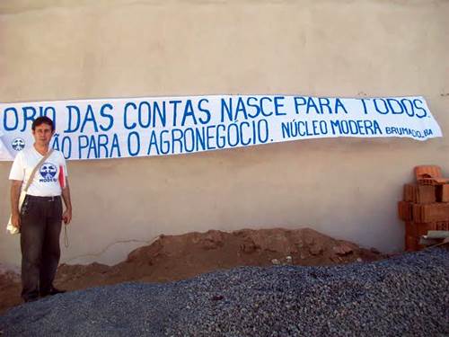 O Coordenador Geral do MODERA e membro do Comitê, Aurino Ferreira dos Anjos, disse que ver o projeto das barragens do agronegócio como uma ameaça ao abastecimento das Cidades de Brumado e de Malhada de Pedras, considerando que, quando essas duas cidades dependiam das águas do Rio do Antônio, as mesmas foram represadas à montante, no Açude de Truvisco em Caculé e agora o projeto das barragens do agronegócio conspira para que ocorra algo semelhante. Presente também à Plenária, o Promotor de Justiça do Alto Paraguaçu, Augusto César Matos, avaliou como salutar todo o debate, mas considerou que o mesmo não pode dar uma solução para o impasse, porque ainda não foi concluído o Estudo de Impacto Ambiental – EIA do projeto e nem tão pouco foram realizadas as audiências públicas referentes àquele Estudo. Dentro do ítem de encaminhamentos da pauta da Plenária, foi franqueada a palavra ao Coordenador do MODERA e membro da Câmara Técnica de Educação Ambiental e Mobilização Social do Comitê, Jorge Valério Gomes, o qual leu a Carta do MODERA ao Comitê, que trata da acentuação dos conflitos pelo uso da água em decorrência da estiagem prolongada na Região do Alto Contas e apresenta as seguintes propostas: balanço hídrico das sub-bacias da Região no sentido de priorizar o abastecimento humano; arbitragem dos conflitos pelo Comitê em primeira instância administrativa no uso da sua competência legal e ações pelo embargo da construção das barragens do agronegócio. Após a Plenária, ativistas do MODERA protestaram em vias públicas da Cidade de Abaíra, abrindo uma faixa com os seguintes dizeres: “o Rio das Contas nasce para todos. Não para o agronegócio”. Os protestos contaram até com a participação do cordelista Zé Walter, a princípio muito tímido, no que se refere às mobilizações sociais.
