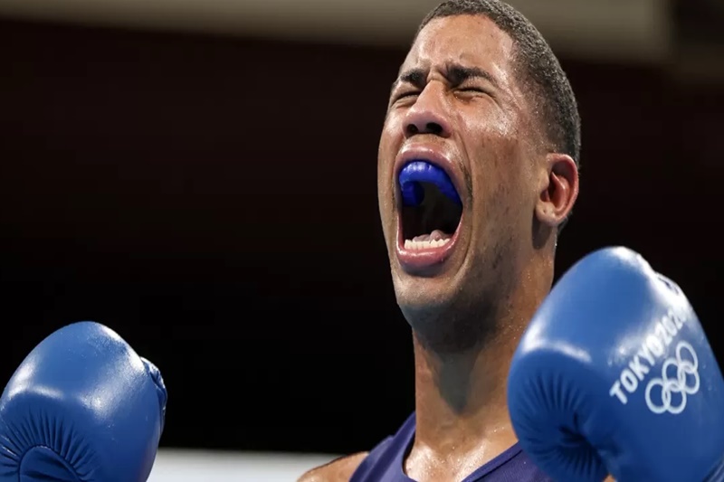 Hebert Conceição comemora o nocaute que garantiu a medalha de ouro no boxe dos Jogos Olímpicos de Tóquio Imagem: Xinhua/Ou Dongqu
