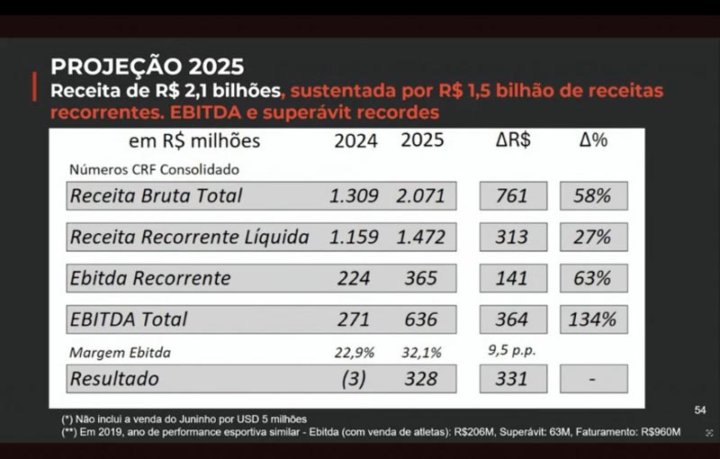 A situação da dívida também foi detalhada. Segundo o balanço, o passivo foi reduzido de R$ 346 milhões para R$ 96 milhões em 2025. A projeção da diretoria é encerrar a temporada de 2026 com uma dívida estimada em R$ 41 milhões.