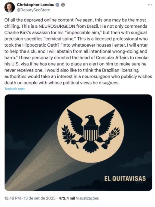 O vice-secretário de Estado dos Estados Unidos, Christopher Landau, afirmou que pediu a revogação do visto de um brasileiro por elogiar nas redes sociais o assassinato do ativista conservador Charlie Kirk.