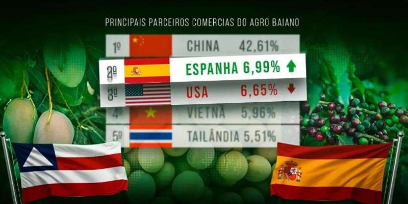Por exemplo, em junho, os Estados Unidos importaram mais de 55 milhões de dólares em produtos agrícolas da Bahia, estabelecendo-se como o segundo maior destino do setor, perdendo apenas para a China. Em julho, as importações dos Estados Unidos atingiram cerca de US$ 35 milhões, levando os americanos a perder a posição de segundo maior parceiro comercial do agro baiano pela primeira vez no ano, para a Espanha, que alcançou um valor de US$ 36,8 milhões.