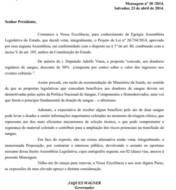 Duas semanas após ser aprovado, o projeto chegou a ser integralmente vetado pelo ex-governador Jaques Wagner (PT). O então chefe do Executivo alegou uma recomendação do Ministério da Saúde acerca de não autorizar medidas do tipo, por altruísmo. Segundo argumento utilizado pelo ex-gestor, baseado nas indicações da pasta, a aprovação da Lei poderia gerar a omissão de informações no momento da doação, o que poderia prejudicar a segurança dos materiais coletados e causar riscos na transfusão de sangue.